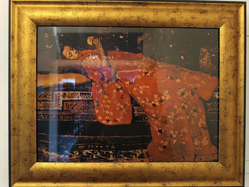 Dieser Kunstdruck zeigt ein Mädchen in einem leuchtend roten Kimono, das friedlich auf einer Chaiselongue mit reich gemusterten Stoffen liegt. Das Gemälde strahlt Ruhe und Eleganz aus und ist perfekt für Liebhaber asiatischer Kunst und Vintage-Dekoration. Ideal für Wohn- oder Schlafzimmerdekor.
